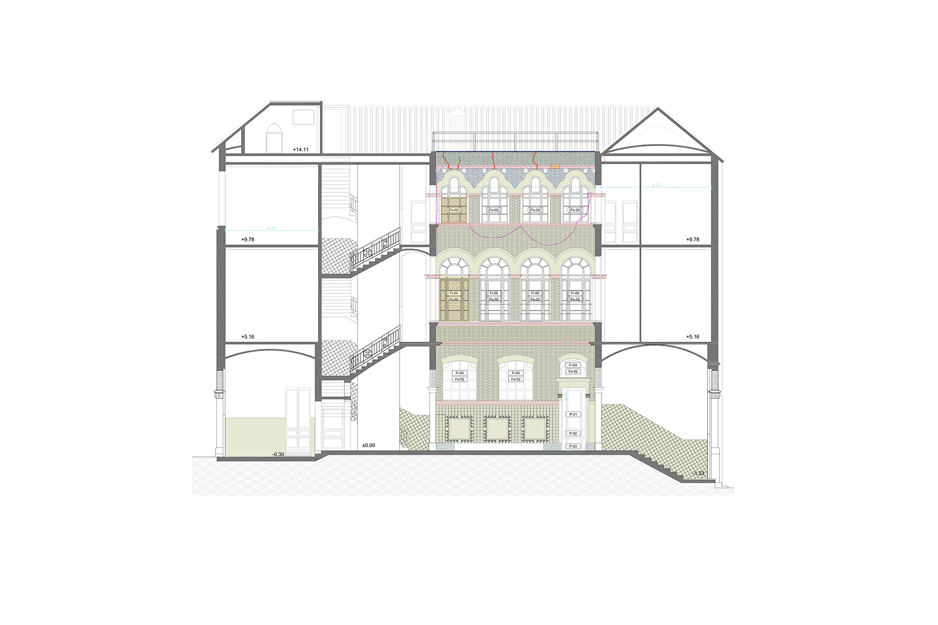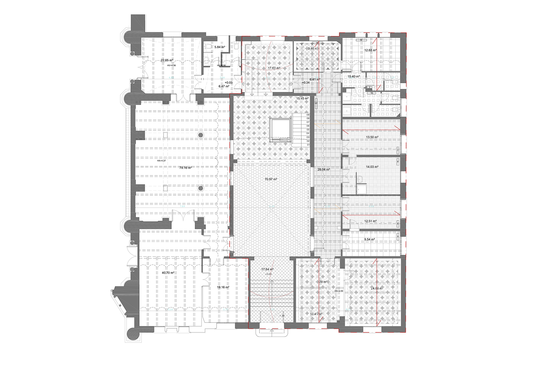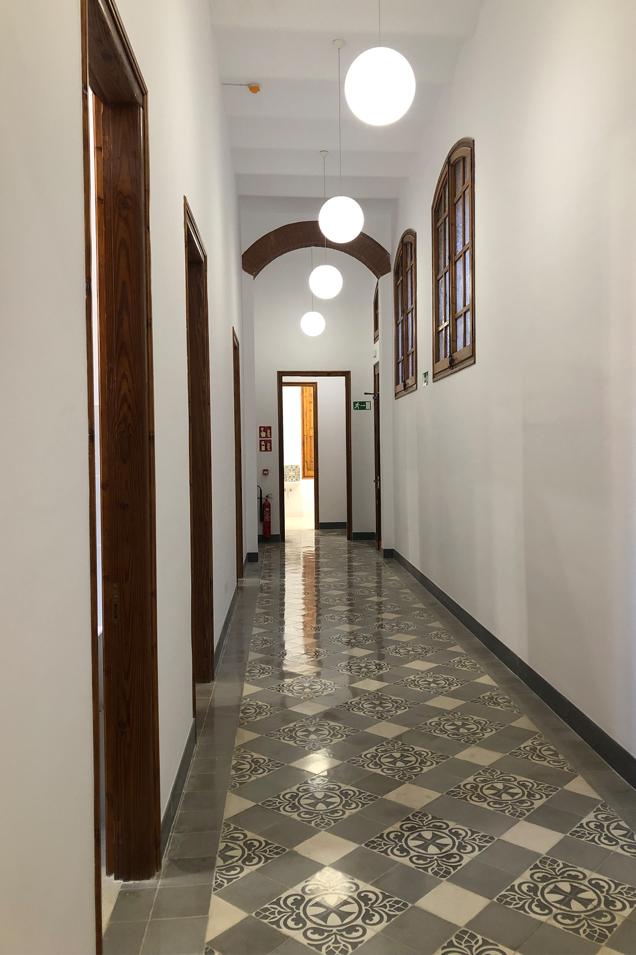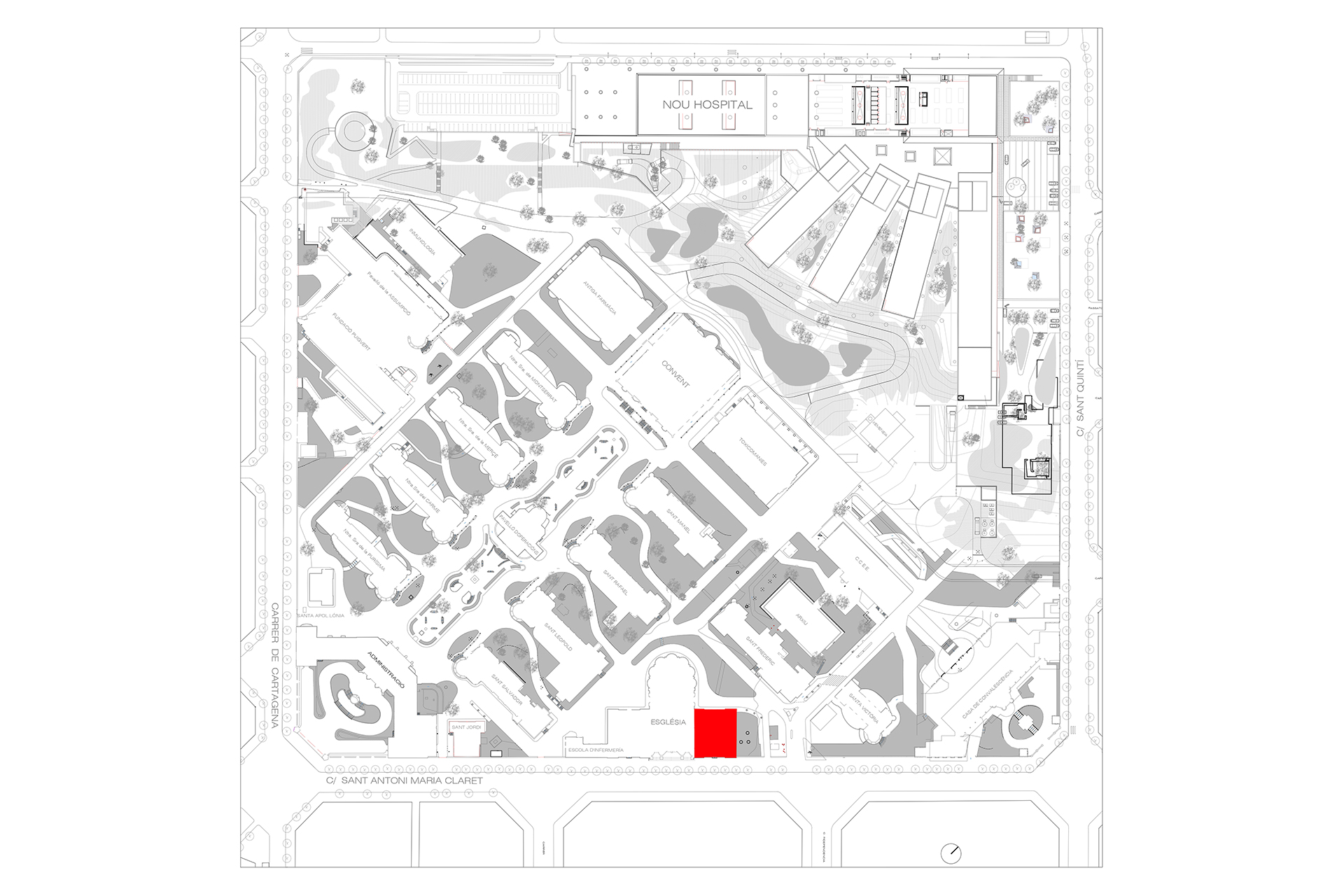 Rehabilitación parcial de la planta baja del ala este del pabellón de la iglesia para ampliar los espacios de la Escuela Universitaria de Enfermería que actualmente ocupa el ala oeste, y reformar la planta primera para un uso de pública concurrencia. Razón por la cual, el edificio se tiene que adecuar para que cohabiten diferentes usos, manteniendo a la vez el actual uso residencial de las viviendas existentes.
