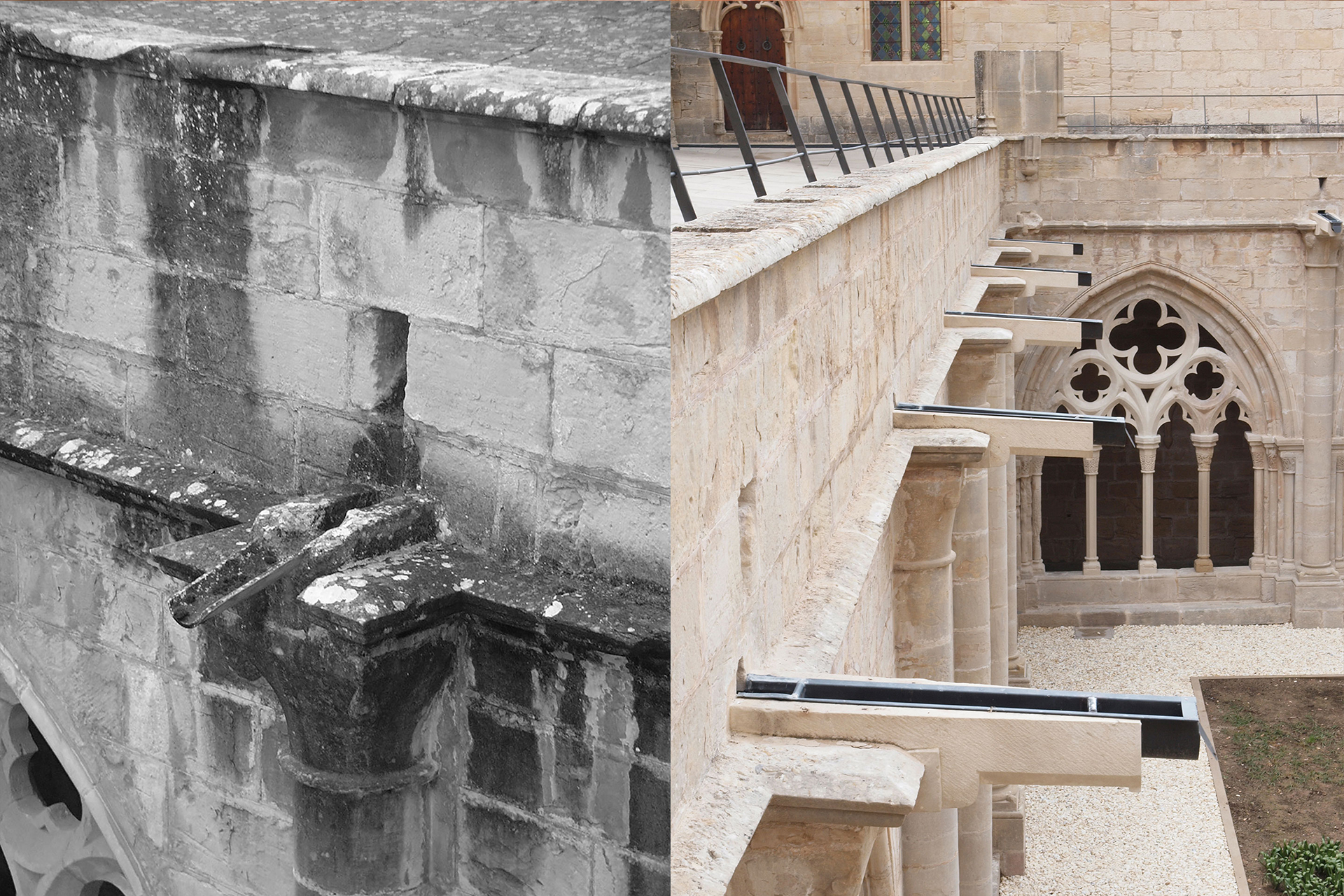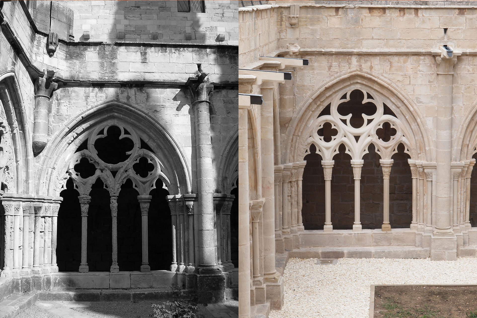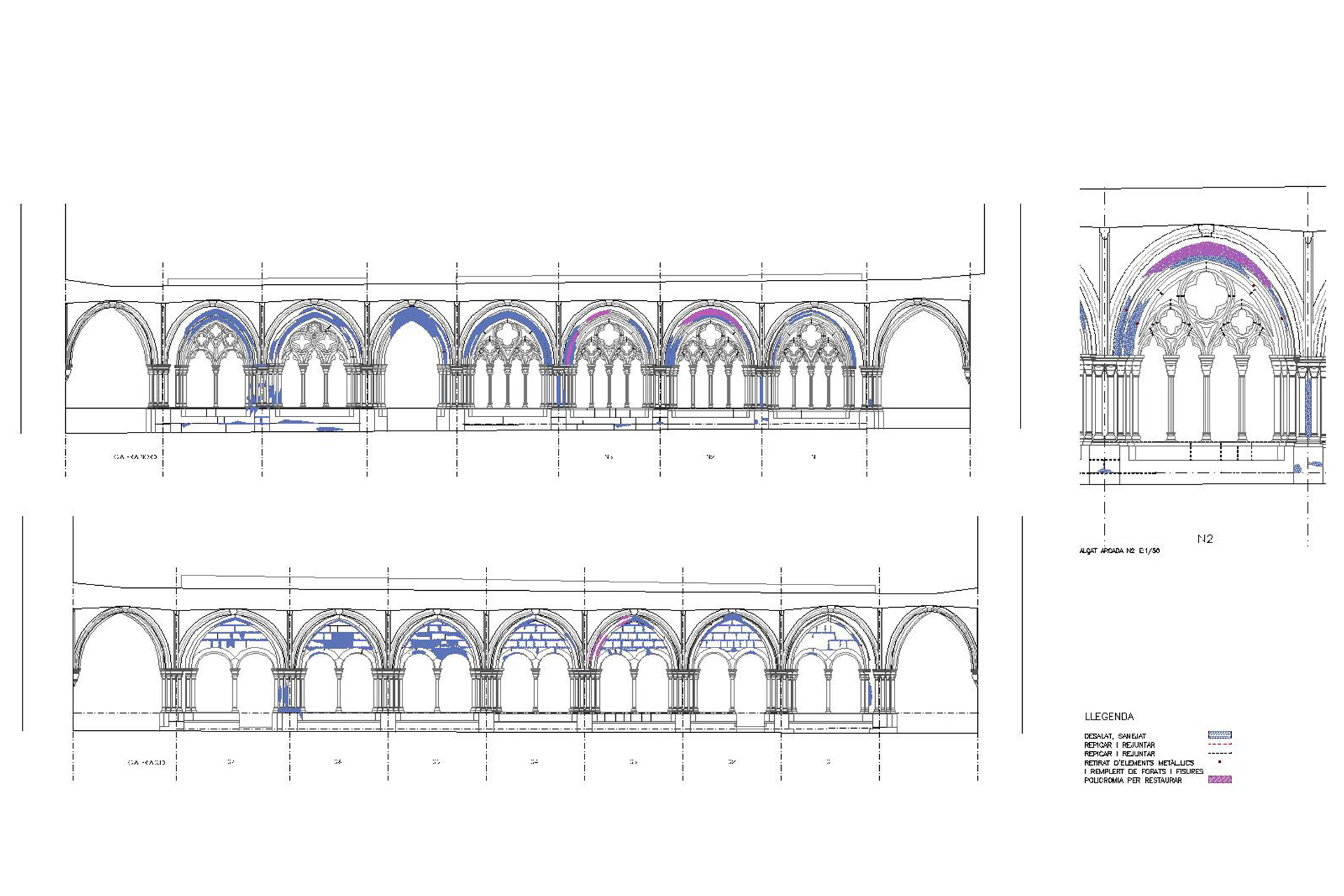 En la primera fase de las obras se trabajó en las cubiertas del claustro y del templete, para proteger e impedir las entradas de agua en las bóvedas y dirigir, canalizar y evacuar las aguas pluviales. Después de un ciclo anual, se comenzó con la segunda fase interviniendo en el patio, las galería inferiores y el templete, para evacuar del patio las aguas pluviales, proteger y consolidar las bóvedas y los paramentos verticales de las galerías, así como acondicionar el jardín.
